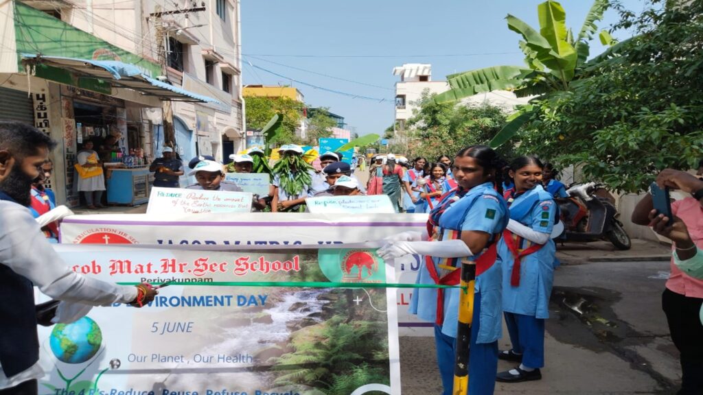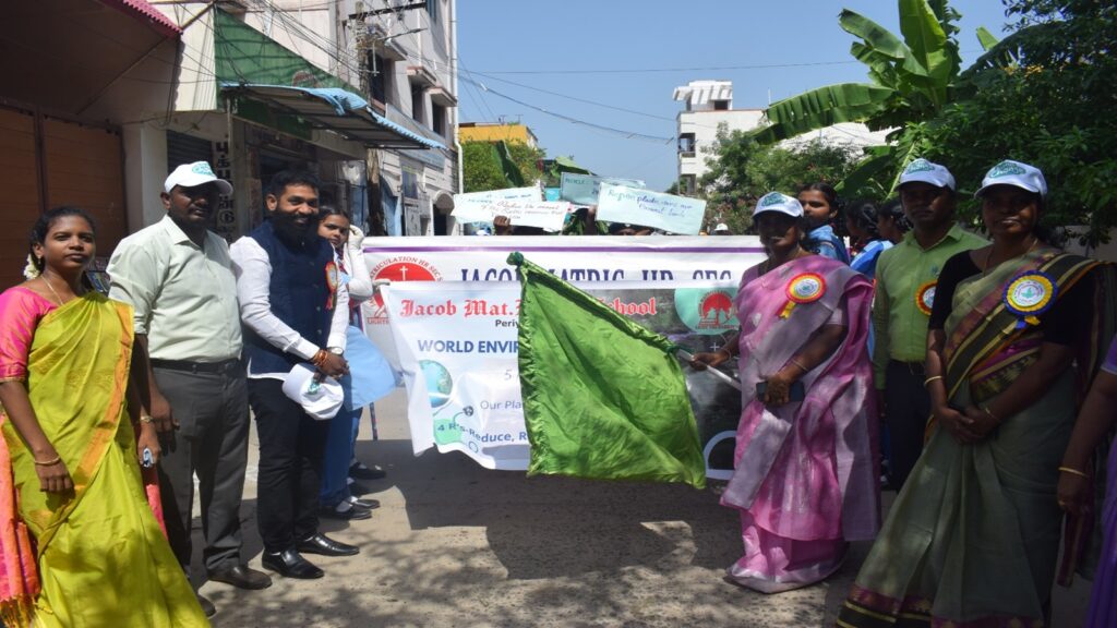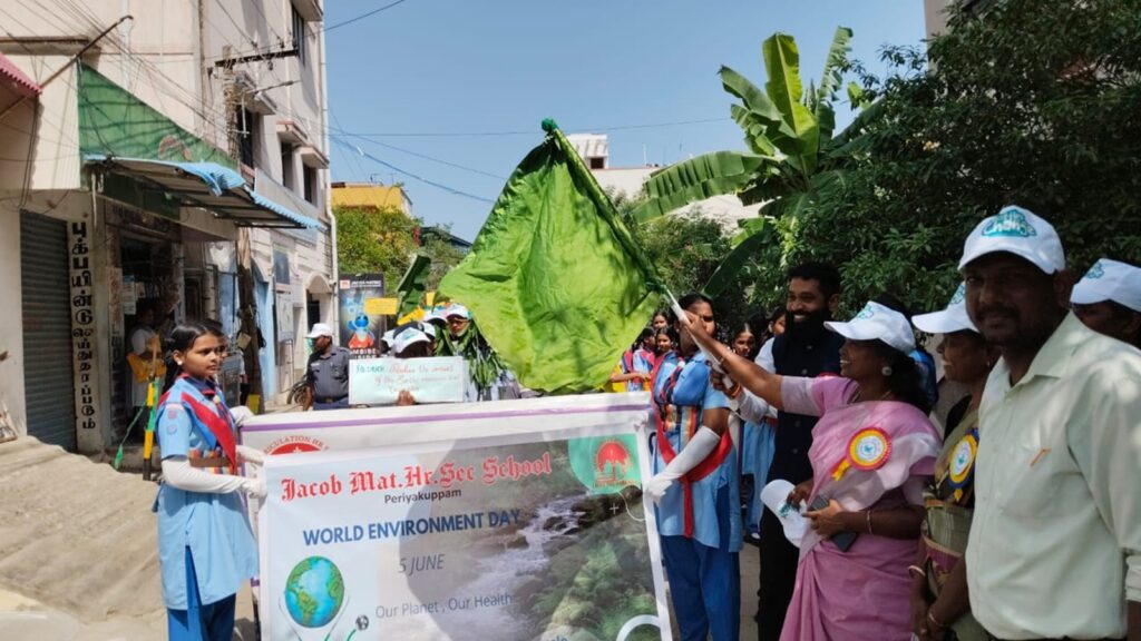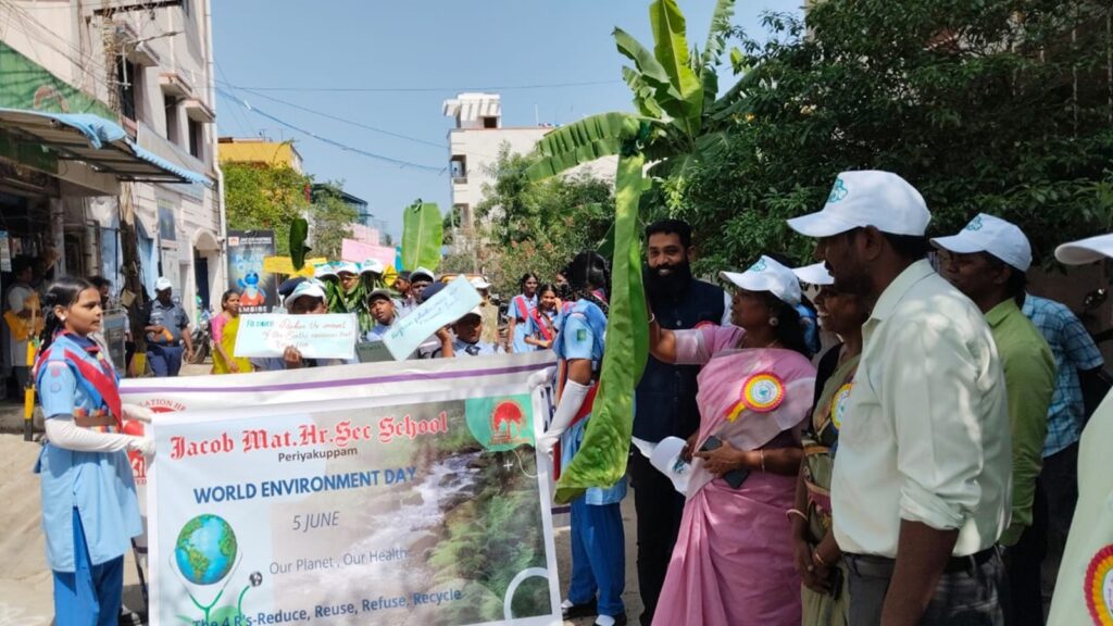 Tiruvallur District, Tamil Nadu – June 5, 2025 – Over 350 enthusiastic students from Jacob Matric Higher Secondary School, a branch of Jacob Group of Schools in Tiruvallur, participated in a vibrant rally on World Environment Day, June 5, 2025. The rally aimed to raise public awareness about environmental protection and the critical need to “Nurture Nature to Nurture our Future.” The event commenced at 9:00 AM with dignitaries from the District Education Department and the Rotary Club gracing the occasion. Mrs. Thenmozhi, DEO-Private Schools Tiruvallur, flagged off the rally, followed by Mr. A.G. Suresh from the Rotary Club, who officially inaugurated the event by cutting the ribbon. Mr. J.Y. James Jayaraj, Correspondent of Jacob Group of Schools, led the procession, with Mrs. K. Joyce Maria, the esteemed Principal, guiding the eco-friendly initiative. Throughout the rally, participants sang a special theme song. Students proudly displayed eye-catching eco-friendly materials, including saplings, seed balls, and seed bags containing neem, pungam, tamarind, and mixed seeds. They also carried informative placards adorned with thought-provoking slogans emphasizing the 4 R’s: Refuse, Reduce, Reuse, and Recycle. The air was filled with enthusiastic chants of “Go Green!” and “Save Nature!”, further amplifying the message of environmental responsibility. The rally underscored the importance of shunning plastics and embracing sustainable alternatives like mud pots, tea cups, paper, jute bags, and yellow cloth bags. Senior Vice Principal Mrs. Gladies Luie, Vice Principal Mr. Prathap (Higher Secondary Dept.), Vice Principal Mrs. Humera Rukshana (High School Dept.), and Head Mistress Mrs. Rajasekari (Primary Dept.), along with other dedicated teachers, also participated, providing encouragement to every student. The event concluded with a powerful message: “Tiny change, Big Impact — Save the Earth!” and a collective call to action: “It is the right time to Care our Nature! to Save our Future!!!”